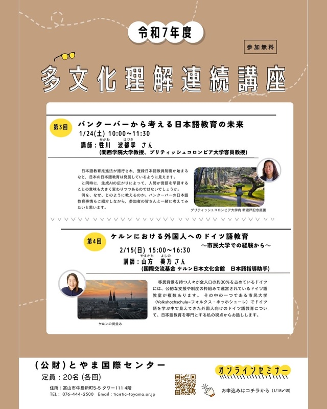 - 牲川波都季(2026年1月24日).「バンクーバーから考える日本語教育の未来」とやま国際センター多文化理解連続講座(オンライン).[チラシ]